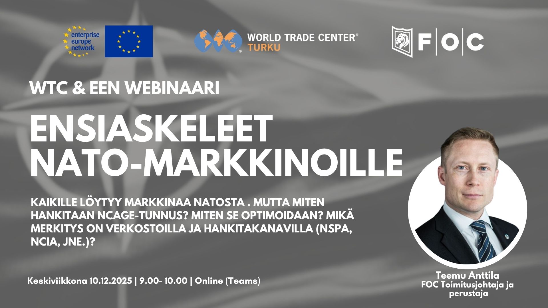 Tässä webinaarissa FOC:n toimitusjohtaja ja perustaja Teemu Anttila käy läpi käytännön askeleet, joilla yritys voi lähteä kansainväliseen kasvuun NATO-markkinoiden kautta. Saat selkeän kokonaiskuvan siitä: