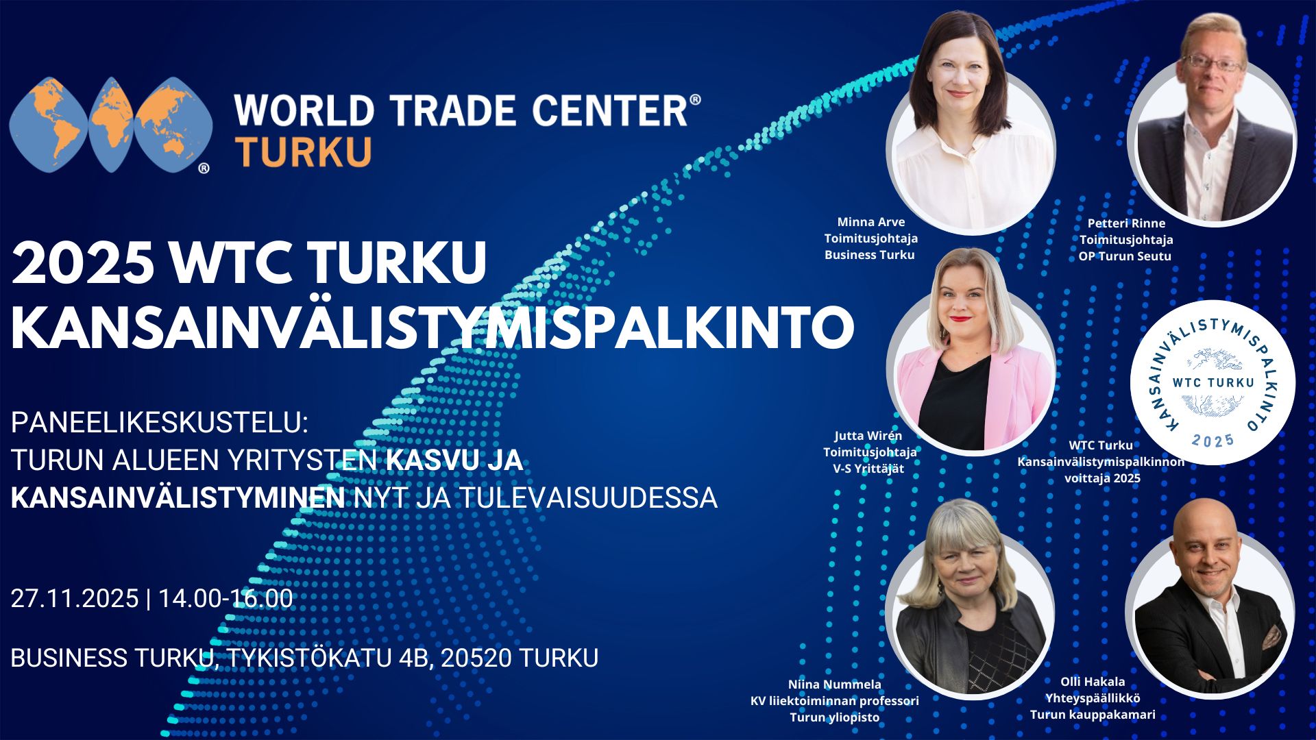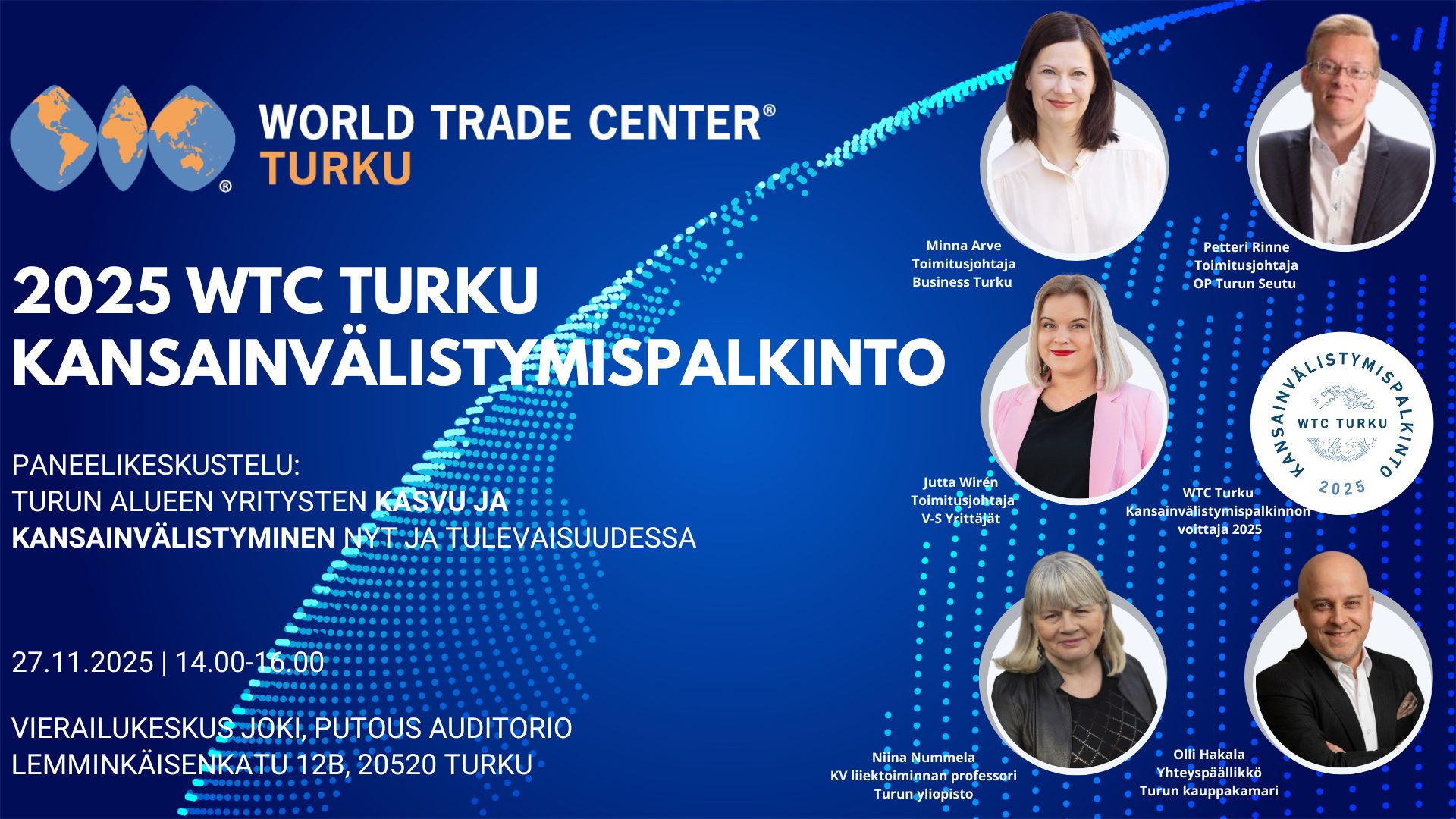 Tule mukaan juhlistamaan Varsinais-Suomen kansainvälisesti menestyneitä yrityksiä ja kuulemaan, kuka saa vuoden 2025 WTC Turku Kansainvälistymispalkinnon!